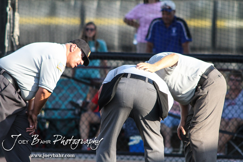 Umpires check on the Home Plate umpire after he to a ball off his body in the bottom of the Sixth Inning. The Great Bend Chiefs won the AAA Lower Zone 1 & 2 Tournament by defeating the Garden City Elite 10 to 4 at Great Bend Sports Complex in Great Bend, Kansas on July 18, 2016. (Photo: Joey Bahr, www.joeybahr.com)undefined