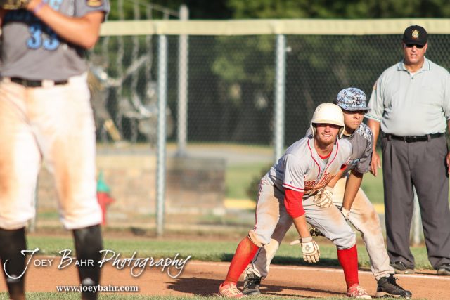 Great Bend Chief Payton Mauler (#12) watches the pitching motion of Garden City Elite Sloan Baker (#33) for an opening to run. The Great Bend Chiefs won the AAA Lower Zone 1 & 2 Tournament by defeating the Garden City Elite 10 to 4 at Great Bend Sports Complex in Great Bend, Kansas on July 18, 2016. (Photo: Joey Bahr, www.joeybahr.com)undefined
