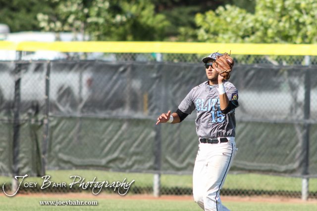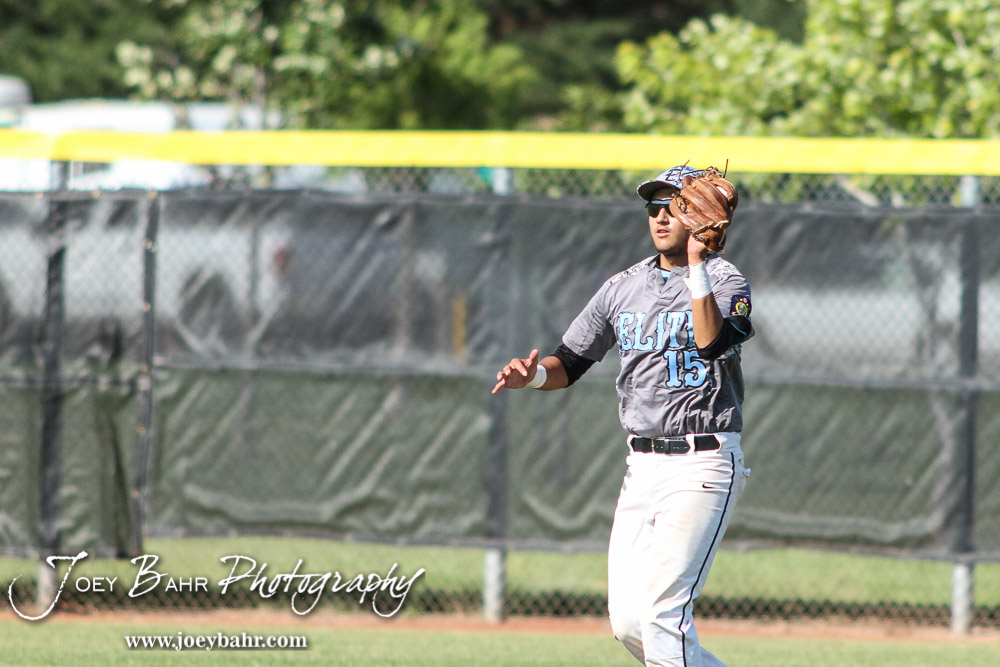 Garden City Elite Syrus Schwartz (#15) catches a fly ball to end the First Inning. The Great Bend Chiefs won the AAA Lower Zone 1 & 2 Tournament by defeating the Garden City Elite 10 to 4 at Great Bend Sports Complex in Great Bend, Kansas on July 18, 2016. (Photo: Joey Bahr, www.joeybahr.com)undefined