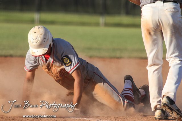 Great Bend Chief Kody Lang (#13) slides into Third Base on a double steal. The Great Bend Chiefs won the AAA Lower Zone 1 & 2 Tournament by defeating the Garden City Elite 10 to 4 at Great Bend Sports Complex in Great Bend, Kansas on July 18, 2016. (Photo: Joey Bahr, www.joeybahr.com)undefined