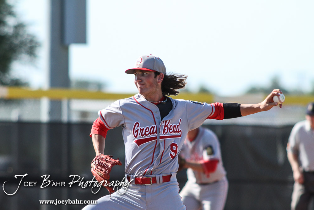 Great Bend Chief Brayden Smith (#9) throws a pitch in the bottom of the First Inning. The Great Bend Chiefs won the AAA Lower Zone 1 & 2 Tournament by defeating the Garden City Elite 10 to 4 at Great Bend Sports Complex in Great Bend, Kansas on July 18, 2016. (Photo: Joey Bahr, www.joeybahr.com)undefined