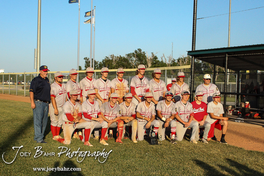 The Great Bend Chiefs Line up for a team photograph with the American Legion Representative and the Zone Tournament Trophy. The Great Bend Chiefs won the AAA Lower Zone 1 & 2 Tournament by defeating the Garden City Elite 10 to 4 at Great Bend Sports Complex in Great Bend, Kansas on July 18, 2016. (Photo: Joey Bahr, www.joeybahr.com)undefined