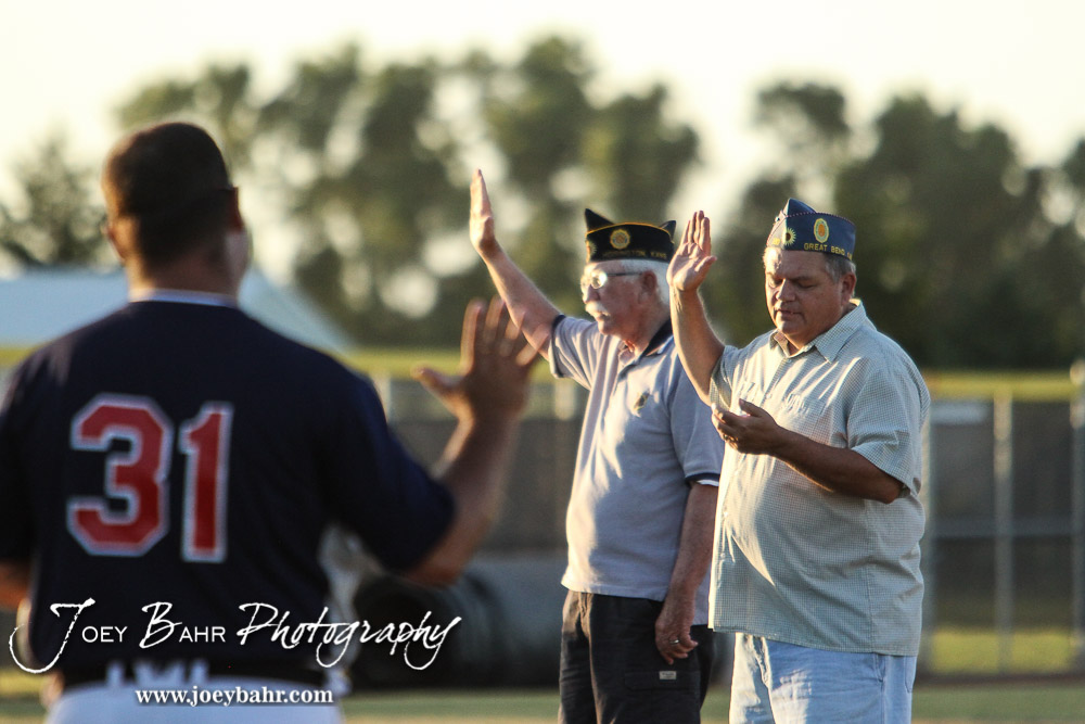 Brad Kuhn of the Argonne Post 180 American Legion administers the Code of Sportsmanship. The Buhler Nationals defeated the Great Bend Braves 7 to 3 in the American Legional Class A Baseball State Tournament Semifinal at the Great Bend Sports Complex in Great Bend, Kansas on July 21, 2016. (Photo: Joey Bahr, www.joeybahr.com)undefined