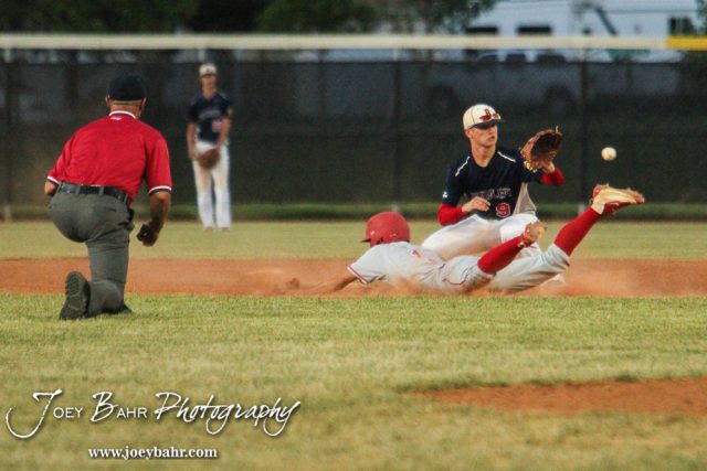 Buhler Nationals #9 Adam Schrag readies to catch the ball as Great Bend Braves #1 Keaton Reneau slides into Second Base. The Buhler Nationals defeated the Great Bend Braves 7 to 3 in the American Legional Class A Baseball State Tournament Semifinal at the Great Bend Sports Complex in Great Bend, Kansas on July 21, 2016. (Photo: Joey Bahr, www.joeybahr.com)undefined
