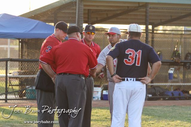 Great Bend Braves Head Coach Pablo Maciel and Buhler Nationals Head Coach John Neill meet with the Umpires prior to the game. The Buhler Nationals defeated the Great Bend Braves 7 to 3 in the American Legional Class A Baseball State Tournament Semifinal at the Great Bend Sports Complex in Great Bend, Kansas on July 21, 2016. (Photo: Joey Bahr, www.joeybahr.com)undefined