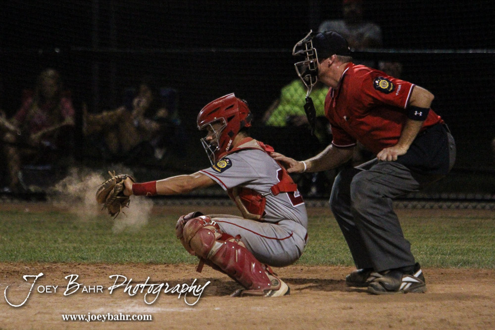 Great Bend Braves #27 Koy Brack catches a pitch as dust flies everywhere. The Buhler Nationals defeated the Great Bend Braves 7 to 3 in the American Legional Class A Baseball State Tournament Semifinal at the Great Bend Sports Complex in Great Bend, Kansas on July 21, 2016. (Photo: Joey Bahr, www.joeybahr.com)undefined