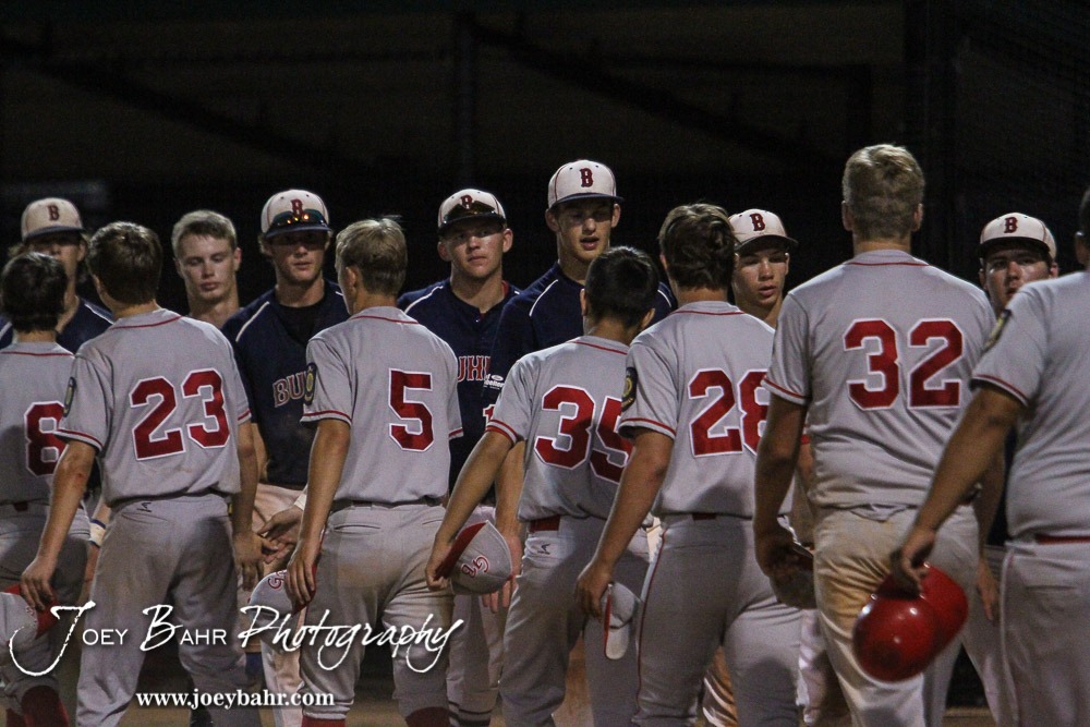Members of the Great Bend Braves and Buhler Nationals shake hands following the game. The Buhler Nationals defeated the Great Bend Braves 7 to 3 in the American Legional Class A Baseball State Tournament Semifinal at the Great Bend Sports Complex in Great Bend, Kansas on July 21, 2016. (Photo: Joey Bahr, www.joeybahr.com)undefined