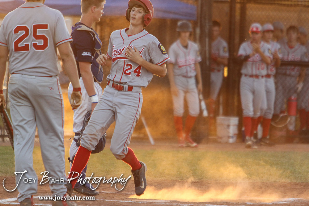 Great Bend Braves #24 Dalton Bieker crosses home plate to score the first run of the game in the First Inning. The Buhler Nationals defeated the Great Bend Braves 7 to 3 in the American Legional Class A Baseball State Tournament Semifinal at the Great Bend Sports Complex in Great Bend, Kansas on July 21, 2016. (Photo: Joey Bahr, www.joeybahr.com)undefined