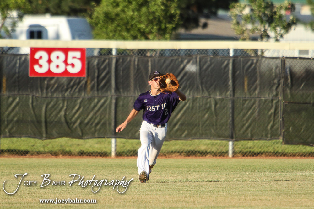 Arkansas City Grays #2 Chase Watkins catches a fly ball. The Arkansas City Grays won over the Salina Hawks 12 to 5 in the American Legional Class A Baseball State Tournament Semifinal at the Great Bend Sports Complex in Great Bend, Kansas on July 21, 2016. (Photo: Joey Bahr, www.joeybahr.com)undefined