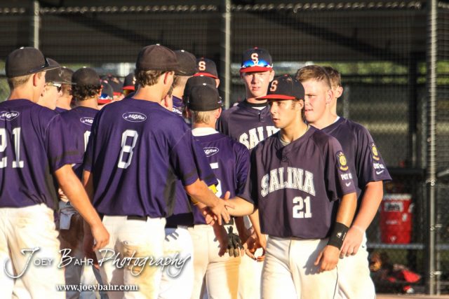 Members of the Salina Hawks and the Arkansas City Grays shake hands following the game. The Arkansas City Grays won over the Salina Hawks 12 to 5 in the American Legional Class A Baseball State Tournament Semifinal at the Great Bend Sports Complex in Great Bend, Kansas on July 21, 2016. (Photo: Joey Bahr, www.joeybahr.com)undefined