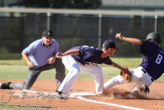 Salina Hawks #25 Brady McAfee tries to tag Arkansas City Grays #8 Hunter O’Toole. The Arkansas City Grays won over the Salina Hawks 12 to 5 in the American Legional Class A Baseball State Tournament Semifinal at the Great Bend Sports Complex in Great Bend, Kansas on July 21, 2016. (Photo: Joey Bahr, www.joeybahr.com)undefined
