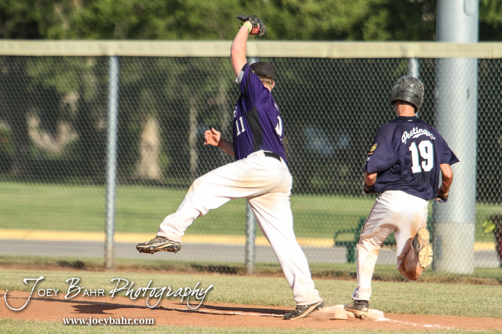 Arkansas City Grays #11 Dominique Marr pulls in the ball to get Salina Hawks #19 Braden Diehl out. The Arkansas City Grays won over the Salina Hawks 12 to 5 in the American Legional Class A Baseball State Tournament Semifinal at the Great Bend Sports Complex in Great Bend, Kansas on July 21, 2016. (Photo: Joey Bahr, www.joeybahr.com)undefined