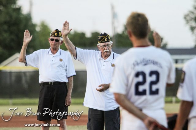 Steve Queen and Bill Dureen of the American Legion administer the Code of Sportsmanship to the players prior to the game. The Salina Hawks defeated the Olathe Kansas Royals 10 to 2 to move on to the American Legional Class A Baseball State Tournament Consolation Finals at the Great Bend Sports Complex in Great Bend, Kansas on July 22, 2016. (Photo: Joey Bahr, www.joeybahr.com)undefined