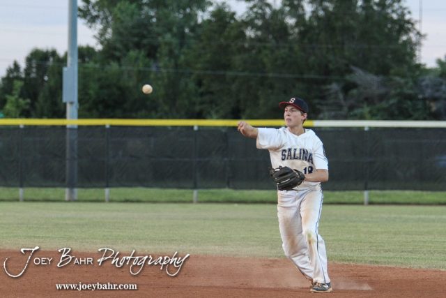 Salina Hawks #19 Braden Diehl throws the ball towards First Base. The Salina Hawks defeated the Olathe Kansas Royals 10 to 2 to move on to the American Legional Class A Baseball State Tournament Consolation Finals at the Great Bend Sports Complex in Great Bend, Kansas on July 22, 2016. (Photo: Joey Bahr, www.joeybahr.com)undefined