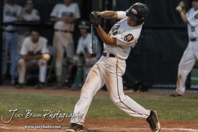 Salina Hawks #24 Mikel Bozarth drives a ball in the bottom of the Third Inning. The Salina Hawks defeated the Olathe Kansas Royals 10 to 2 to move on to the American Legional Class A Baseball State Tournament Consolation Finals at the Great Bend Sports Complex in Great Bend, Kansas on July 22, 2016. (Photo: Joey Bahr, www.joeybahr.com)undefined