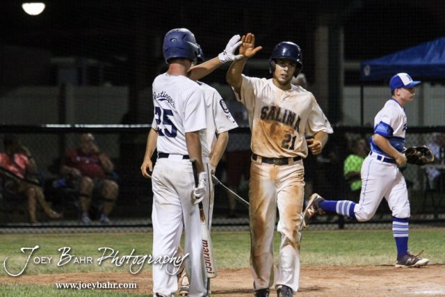 Salina Hawks #25 Brady McAfee congratulates #21 Murphy Seim on winning the game in the Fifth Inning. The Salina Hawks defeated the Olathe Kansas Royals 10 to 2 to move on to the American Legional Class A Baseball State Tournament Consolation Finals at the Great Bend Sports Complex in Great Bend, Kansas on July 22, 2016. (Photo: Joey Bahr, www.joeybahr.com)undefined