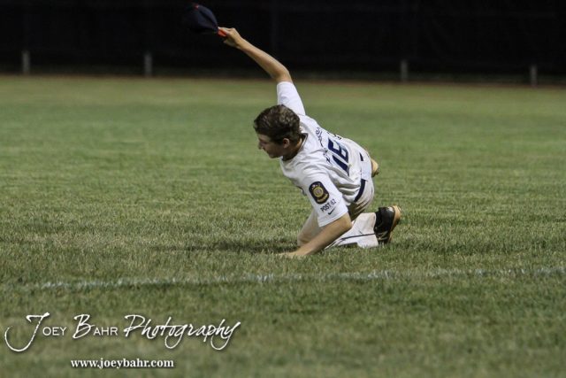Salina Hawks #18 Brenden Tiernan slides in celebration for winning the game. The Salina Hawks defeated the Olathe Kansas Royals 10 to 2 to move on to the American Legional Class A Baseball State Tournament Consolation Finals at the Great Bend Sports Complex in Great Bend, Kansas on July 22, 2016. (Photo: Joey Bahr, www.joeybahr.com)undefined