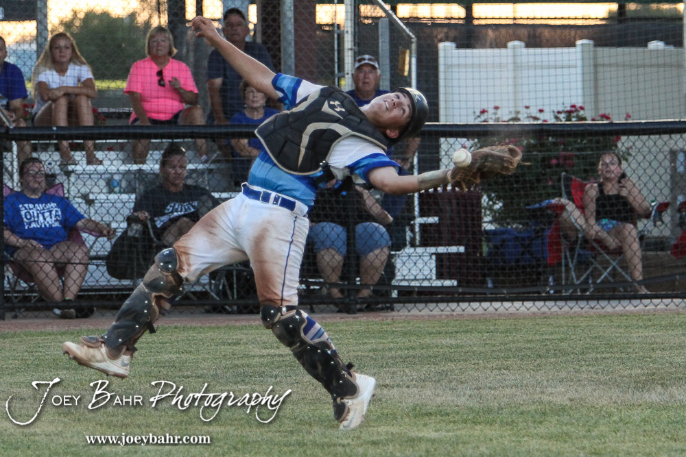 Kansas Royals #50 Gage Witzke misses catching a fly ball in foul territory in the bottom of the First Inning. The Salina Hawks defeated the Olathe Kansas Royals 10 to 2 to move on to the American Legional Class A Baseball State Tournament Consolation Finals at the Great Bend Sports Complex in Great Bend, Kansas on July 22, 2016. (Photo: Joey Bahr, www.joeybahr.com)undefined