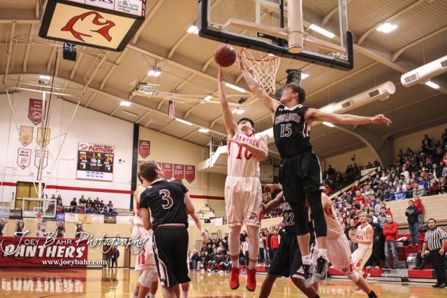 Great Bend Panther #10 Dalton Miller tries for a layup as Buhler Crusader #15 Dalton Smyres tries to swat away the shot. The Buhler Crusaders defeated the Great Bend Panthers by a score of 44 to 36 the Great Bend High School Field House in Great Bend, Kansas on January 12, 2018. (Photo: Joey Bahr, www.joeybahr.com)undefined