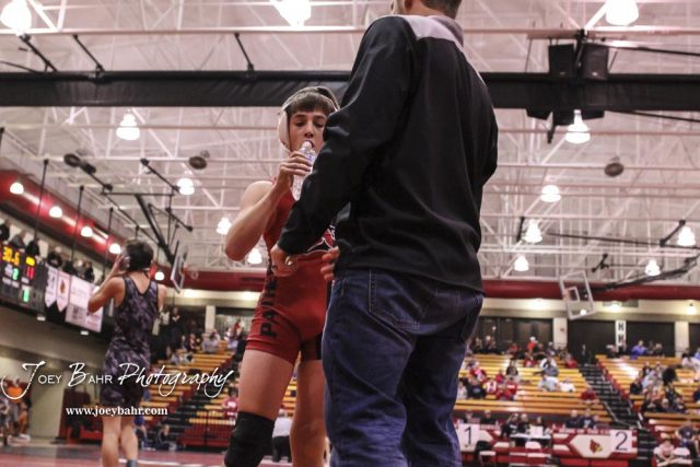 Brantley Baldwin of Great Bend gets a drink of water provided by his coach during an break in the action of the 106 pound weight class match. The 2017 Cardinal Corner Classic Wrestling Tournament was held at Hoisington Activity Center in Hoisington, Kansas on December 15, 2017. (Photo: Joey Bahr, www.joeybahr.com)undefined