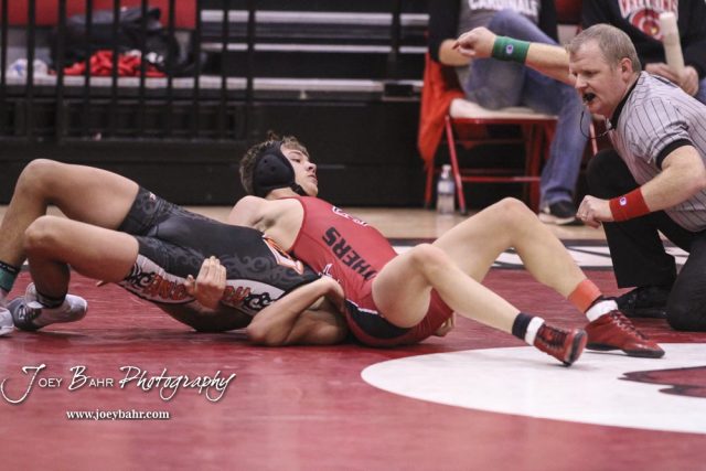 Skylar Burkes of Great Bend pins Sebastian Munoz of Holcomb to win the match in the 126 pound weight class. The 2017 Cardinal Corner Classic Wrestling Tournament was held at Hoisington Activity Center in Hoisington, Kansas on December 15, 2017. (Photo: Joey Bahr, www.joeybahr.com)undefined