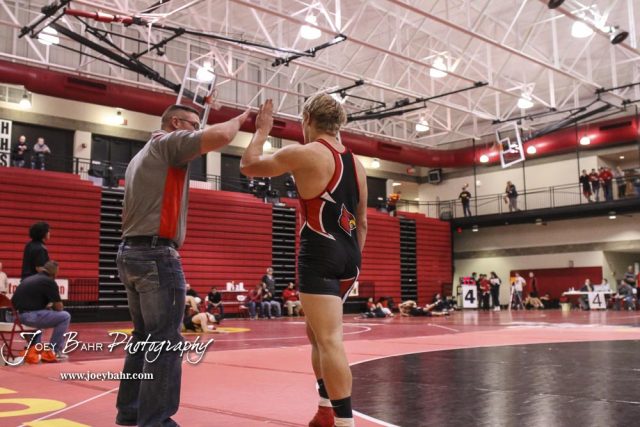 Sean Urban of Hoisington celebrates his pin fall win with a coach. The 2017 Cardinal Corner Classic Wrestling Tournament was held at Hoisington Activity Center in Hoisington, Kansas on December 15, 2017. (Photo: Joey Bahr, www.joeybahr.com)undefined