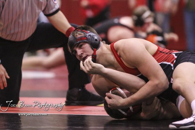 Wyatt Pedigo of Hoisington tries to pin Wiley Brand of Great Bend in the 182 pound weight class match. Pedigo won the match via pin fall. The 2017 Cardinal Corner Classic Wrestling Tournament was held at Hoisington Activity Center in Hoisington, Kansas on December 15, 2017. (Photo: Joey Bahr, www.joeybahr.com)undefined