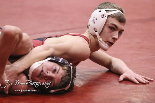 Drew Liles of Great Bend looks back towards his coaches as he covers Matthew Schmitz of Marysville in a 113 pound weight class match. Liles won the match by pin fall. The 2017 Cardinal Corner Classic Wrestling Tournament was held at Hoisington Activity Center in Hoisington, Kansas on December 15, 2017. (Photo: Joey Bahr, www.joeybahr.com)undefined