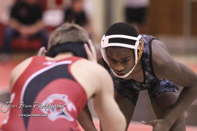 Samajay Alboyd of Larned waits to engage Skylar Burkes of Great Bend from a neutral position in their 126 pound weight class match. Burkes won the match by a 8 to 6 decision. The 2017 Cardinal Corner Classic Wrestling Tournament was held at Hoisington Activity Center in Hoisington, Kansas on December 15, 2017. (Photo: Joey Bahr, www.joeybahr.com)undefined