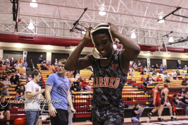 Samajay Alboyd of Larned reacts to losing his 126 pound weight class match in an 8 to 6 decision. The 2017 Cardinal Corner Classic Wrestling Tournament was held at Hoisington Activity Center in Hoisington, Kansas on December 15, 2017. (Photo: Joey Bahr, www.joeybahr.com)undefined