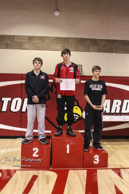 The 126 pound weight class finishers: First Place Blake Leiszler of Concordia, Second Place Ethan Crownover of Marysville, Third Place Skylar Burkes of Great Bend. The 2017 Cardinal Corner Classic Wrestling Tournament was held at Hoisington Activity Center in Hoisington, Kansas on December 15, 2017. (Photo: Joey Bahr, www.joeybahr.com)undefined