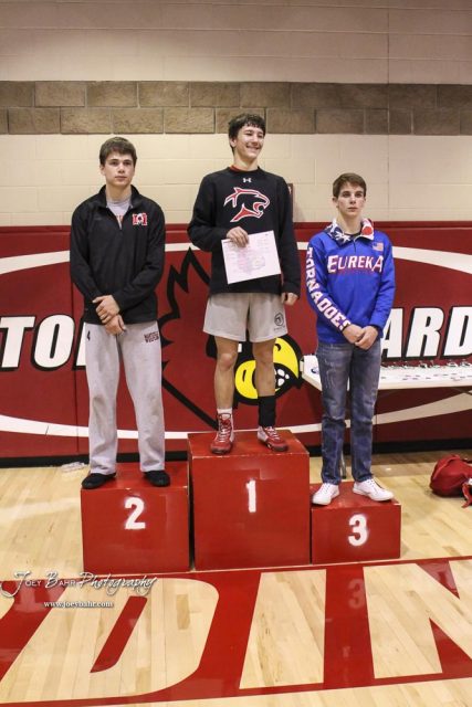 The 132 pound weight class finishers: First Place George Weber of Great Bend, Second Place Jonny Crome of Marysville, Third Place Dominick Bailey of Eureka. The 2017 Cardinal Corner Classic Wrestling Tournament was held at Hoisington Activity Center in Hoisington, Kansas on December 15, 2017. (Photo: Joey Bahr, www.joeybahr.com)undefined