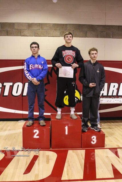 The 138 pound weight class finishers: First Place Tanner Cassity of Hoisington, Second Place Brennan Lowe of Eureka, Third Place Kristopher Nolde of Larned. The 2017 Cardinal Corner Classic Wrestling Tournament was held at Hoisington Activity Center in Hoisington, Kansas on December 15, 2017. (Photo: Joey Bahr, www.joeybahr.com)undefined