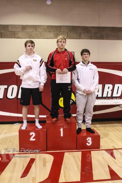 The 170 pound weight class finishers: First Place Sean Urban of Hoisington, Second Place Alan Novak of Holcomb, Third Place Garet Walker of Cimarron. The 2017 Cardinal Corner Classic Wrestling Tournament was held at Hoisington Activity Center in Hoisington, Kansas on December 15, 2017. (Photo: Joey Bahr, www.joeybahr.com)undefined