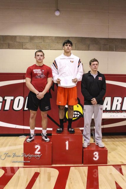 The 182 pound weight class finishers: First Place Chance Rodriguez of Holcomb, Second Place Wyatt Pedigo of Hoisington, Third Place Garron Champoux of Marysville. The 2017 Cardinal Corner Classic Wrestling Tournament was held at Hoisington Activity Center in Hoisington, Kansas on December 15, 2017. (Photo: Joey Bahr, www.joeybahr.com)undefined