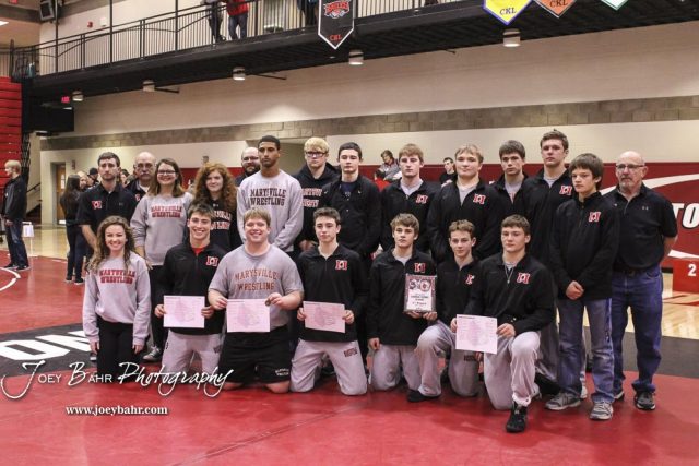 The Marysville team gathers to show off the team trophy and the brackets of their weight class winners after the tournament. The 2017 Cardinal Corner Classic Wrestling Tournament was held at Hoisington Activity Center in Hoisington, Kansas on December 15, 2017. (Photo: Joey Bahr, www.joeybahr.com)undefined