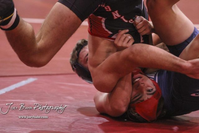 Tate Seabolt of Cimmaron rolls Christopher Ball of Hoisington in their 152 pound weight class match. Ball won the match in a 9 to 1 major decision. The 2017 Cardinal Corner Classic Wrestling Tournament was held at Hoisington Activity Center in Hoisington, Kansas on December 15, 2017. (Photo: Joey Bahr, www.joeybahr.com)undefined