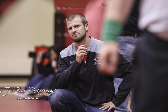 Great Bend Head Coach Nathan Brockelman reacts to a ruling by an official during a match. The 2017 Cardinal Corner Classic Wrestling Tournament was held at Hoisington Activity Center in Hoisington, Kansas on December 15, 2017. (Photo: Joey Bahr, www.joeybahr.com)undefined