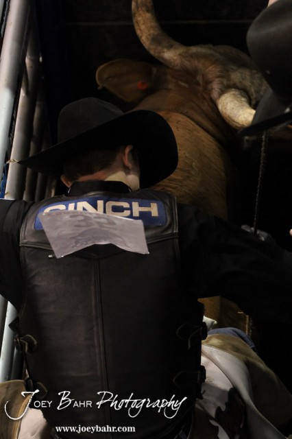 Jay Morrow tightens up his rope on Rocking Wolf from Danny Reagan in the Championship Bull Riding Roto-Mix Dodge City Shootout at United Wireless Arena in Dodge City, Kansas on March 17, 2012. Photo: Joey Bahr