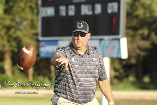 Central Plains Oiler Head Coach Chris Steiner tosses the ball to a player during warmups. The Central Plains Oilers defeated the Little River Redskins by a score of 46 to 0 at Community Memorial Park in Little River, Kansas on September 21, 2018. (Photo: Joey Bahr, www.joeybahr.com)undefined