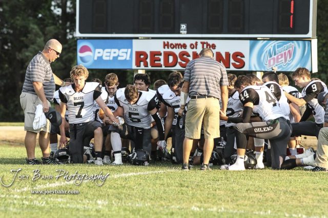 The Central Plains Oilers kneel for a team prayer prior to the start of the game. The Central Plains Oilers defeated the Little River Redskins by a score of 46 to 0 at Community Memorial Park in Little River, Kansas on September 21, 2018. (Photo: Joey Bahr, www.joeybahr.com)undefined