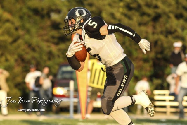 Central Plains Oiler #5 Alex Hickel rushes with the ball on his way to the end zone for a touchdown in the first quarter. The Central Plains Oilers traveled to take on the Little River Redskins at Community Memorial Park in Little River, Kansas on September 21, 2018. (Photo: Joey Bahr, www.joeybahr.com)undefined