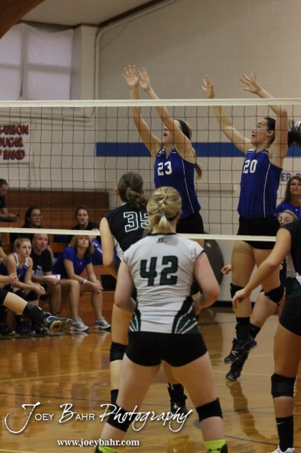 St John Lady Tigers Alexis Witt (#23) and Teresa Christie (#20) set up a wall during Otis-Bison Volleyball Triangular at the Otis-Bison High School in Otis, Kansas on September 25, 2012. (Photo: Joey Bahr, www.joeybahr.com)