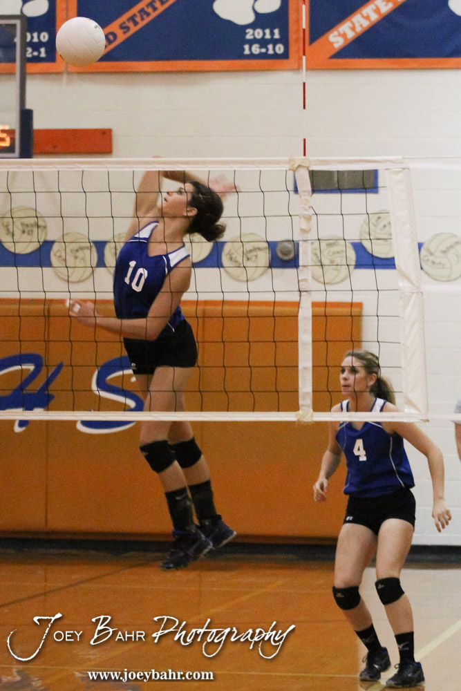 St John Lady Tiger Haley Falk (#10) goes for a kill during Otis-Bison Volleyball Triangular at the Otis-Bison High School in Otis, Kansas on September 25, 2012. (Photo: Joey Bahr, www.joeybahr.com)