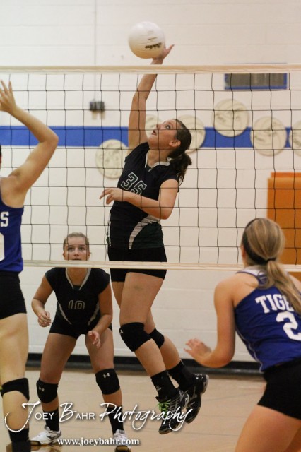 Central Plains Lady Oiler Jennifer Hitschmann (#35) hits the ball over the net during Otis-Bison Volleyball Triangular at the Otis-Bison High School in Otis, Kansas on September 25, 2012. (Photo: Joey Bahr, www.joeybahr.com)