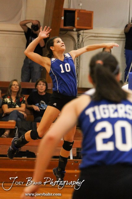 St John Lady Tiger Haley Falk (#10) goes for a kill during Otis-Bison Volleyball Triangular at the Otis-Bison High School in Otis, Kansas on September 25, 2012. (Photo: Joey Bahr, www.joeybahr.com)