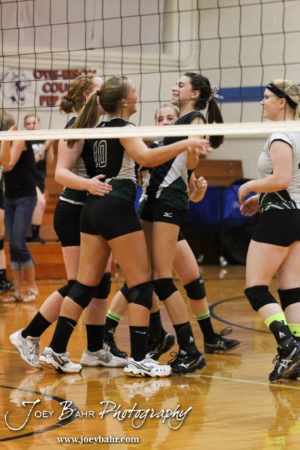 The Central Plains Lady Oilers celebrate defeating the St John Lady Tigers in three sets 17-25, 30-28, and 26-24 during Otis-Bison Volleyball Triangular at the Otis-Bison High School in Otis, Kansas on September 25, 2012. (Photo: Joey Bahr, www.joeybahr.com)