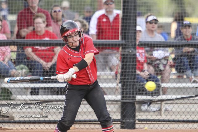 Great Bend Lady Panther #24 Mikayla Bownes swings at a pitch in the Bottom of the 3rd Inning. The Great Bend Lady Panthers defeated the Dodge City Lady Demons 15 to 5 at the Great Bend Sports Complex in Great Bend, Kansas on April 18, 2017. (Photo: Joey Bahr, www.joeybahr.com)undefined