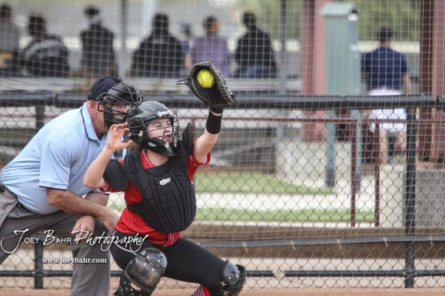 Great Bend Lady Panther #14 Kaylee Unruh catches a pitch in the Top of the 4th Inning. The Great Bend Lady Panthers defeated the Dodge City Lady Demons 15 to 5 at the Great Bend Sports Complex in Great Bend, Kansas on April 18, 2017. (Photo: Joey Bahr, www.joeybahr.com)undefined