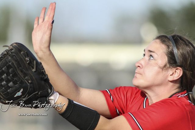 Great Bend Lady Panther #24 Mikayla Bownes lines up a popped up ball with her glove. The Great Bend Lady Panthers defeated the Dodge City Lady Demons 15 to 5 at the Great Bend Sports Complex in Great Bend, Kansas on April 18, 2017. (Photo: Joey Bahr, www.joeybahr.com)undefined